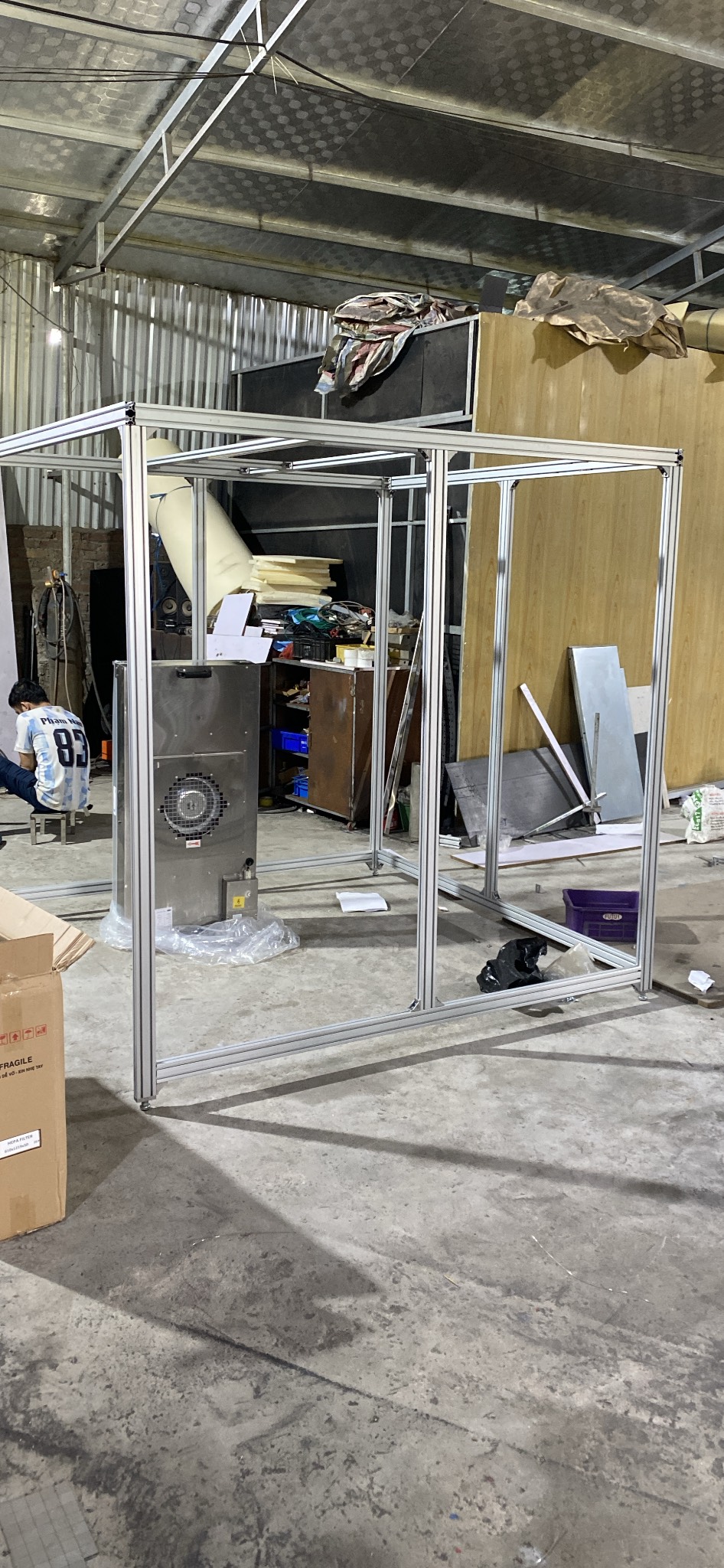Khung làm bằng nhôm định hình, xung quanh là tấm nhựa PVC esd.